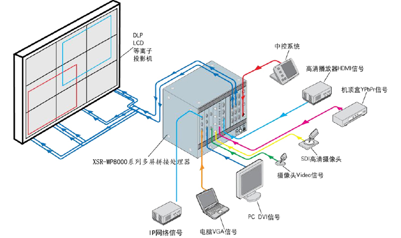 新視銳XSR-WP8000系列多屏拼接圖像處理器典型應用示意圖: