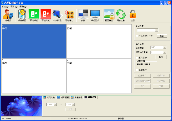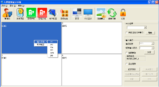 選擇多個(gè)拼接單元,2x2為例,選中4個(gè)屏后,在信源中選擇信號(hào)源,單擊“執(zhí)行”按鈕完成拼接,點(diǎn)擊“圖像凍結(jié)”可以凍結(jié)當(dāng)前畫面,再次點(diǎn)擊解除靜像。