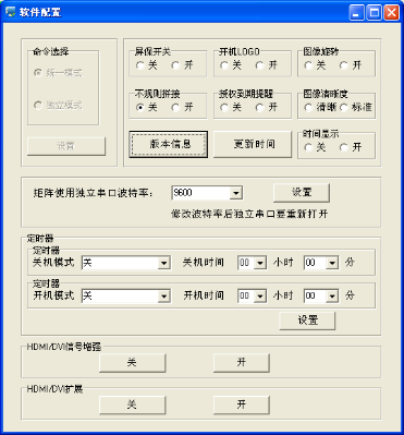 解壓拼接控制軟件、RAR得到以下三個(gè)文件:userlogo、VGA自動(dòng)調(diào)整圖片、串口調(diào)試、LCDWall.exe、LcdWall.exe.manifest、MWS_Cfg.ini,該控制軟件為綠色版,無(wú)需安裝,直接運(yùn)行Lcdwall軟件.exe,彈出如圖1控制界面。(注:所有操作必須在串口打開才能操作)