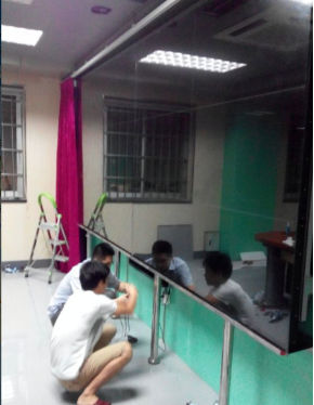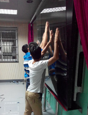 1、把玻璃托住不要讓玻璃下垂(根據(jù)客戶現(xiàn)場的不同環(huán)境來定制),固定好玻璃之后,在把紅外屏貼(粘)上去(配件里面有紅色雙面膠)。